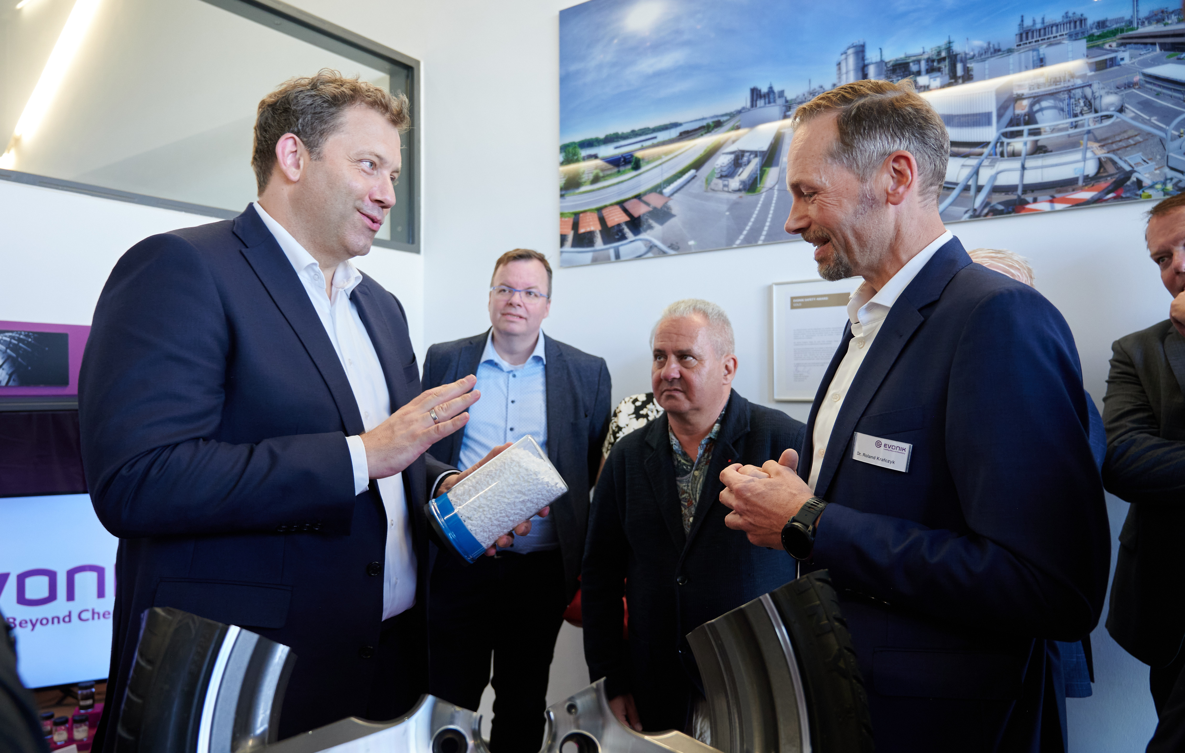 Bei einem Rundgang durch die Anwendungstechnik demonstrierte Leiter Dr. Roland Krafczyk der Delegation, wie sich unterschiedliche Gummi-Mischungen effizient herstellen lassen. Lars Klingbeil nutzte die Gelegenheit, um mit Mitarbeitern auch persönlich ins Gespräch zu kommen und sich einen Eindruck von ihrem Arbeitsalltag zu verschaffen. Krafczyk präsentierte darüber hinaus, wie durch automatisierte Tests die Leistungsfähigkeit der Evonik-Produkte in der Anwendungstechnik geprüft werden, um reale Bedingungen auf der Straße ableiten zu können. Beeindruckt zeigten sich die Besucher von der Wirkung der Silica/Silan-Technologie, die dafür sorgt, dass der Rollwiderstand reduziert und gleichzeitig die Haftung des Reifens bei Nässe erhöht werden. Besonders im Zusammenhang mit steigender Elektromobilität wächst die Nachfrage nach umweltfreundlicheren und rollwiderstandsreduzierten Reifen. Silica wird zudem unter anderem in Zahnpasta, Druckfarben und Klebstoffen eingesetzt.